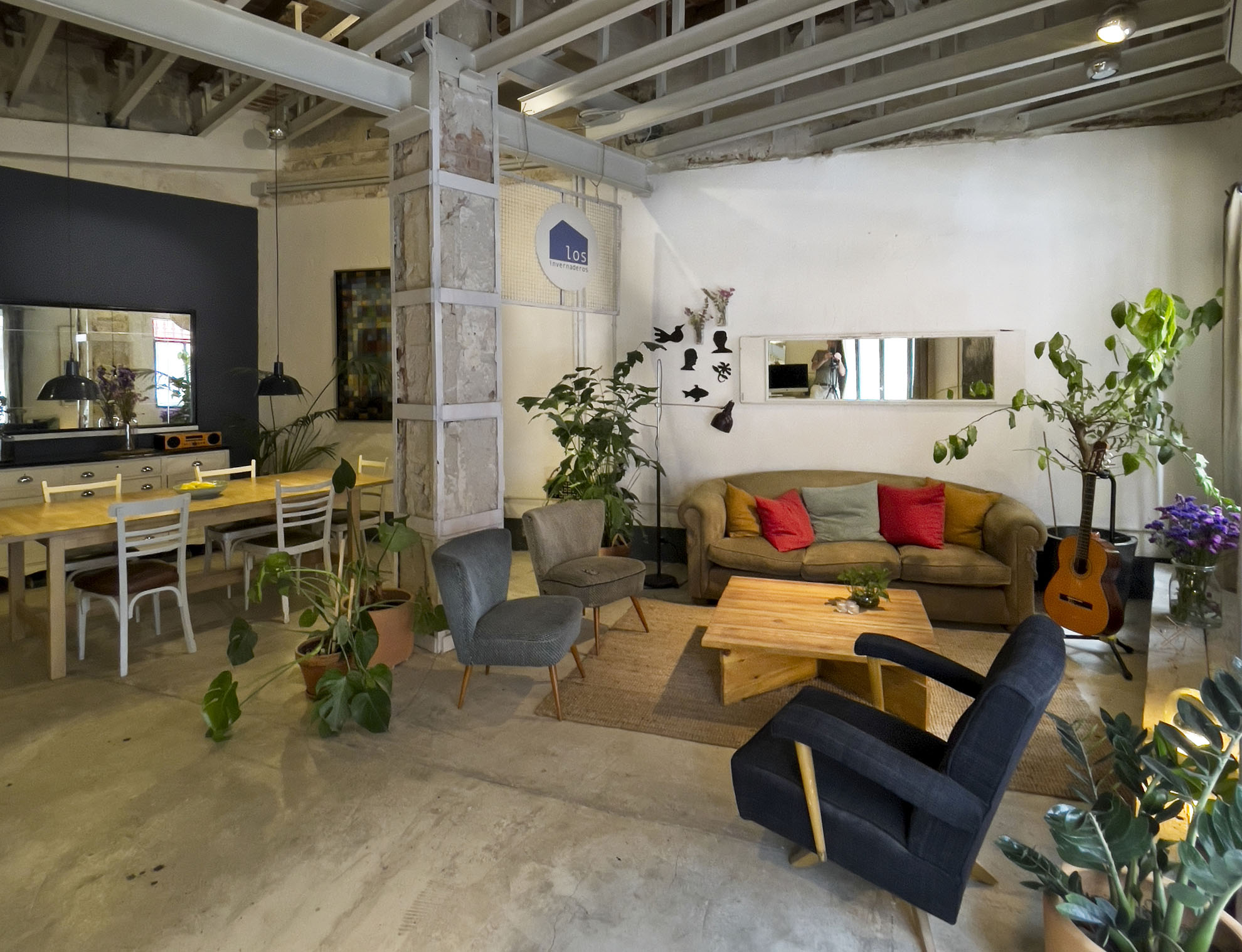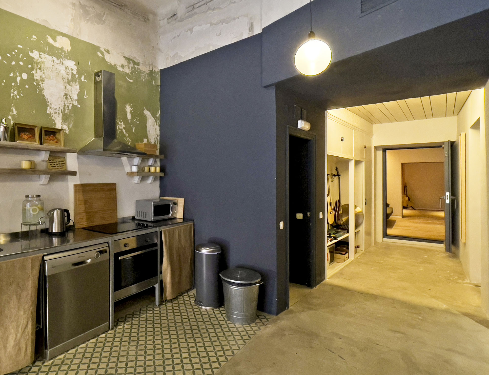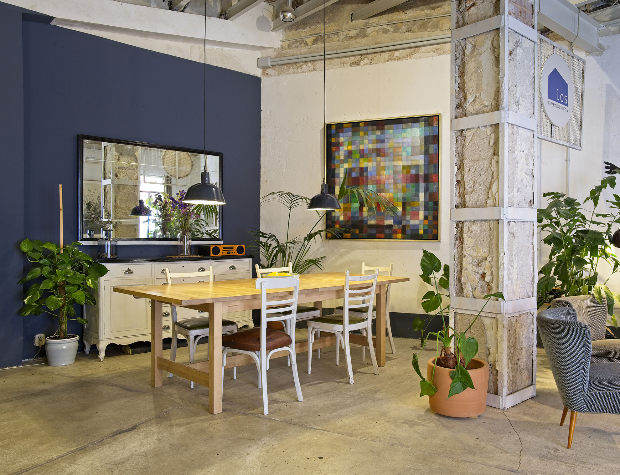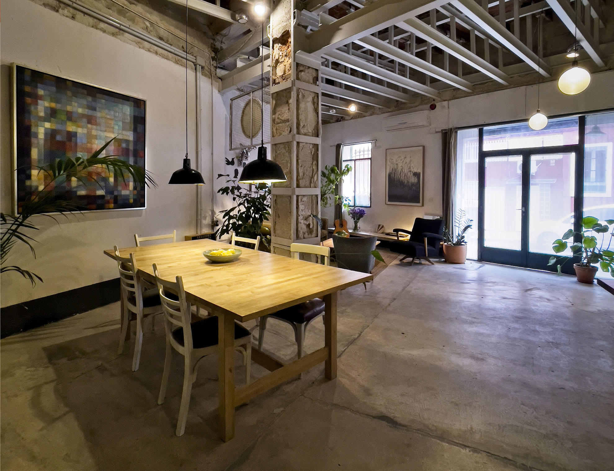 Zona común diáfana con cocina, disponible para grabaciones, podcasts, eventos o shootings. Interconectada mediante patch con los invernaderos A y B.
